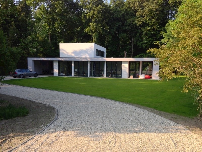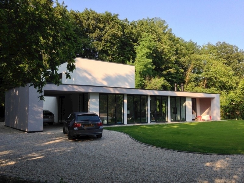 Arkenbout designed this airy & open villa in the woods of the Achterhoek, near Epse, the Netherlands. The dark concrete table gives the house the purpose of a home, solid and safe. The glass & aluminium underneath the table ensures the inhabitants stay connected with the earth surrounding them. The white cube almost literally takes a bite out of it. This way it puts the given security into perspective.